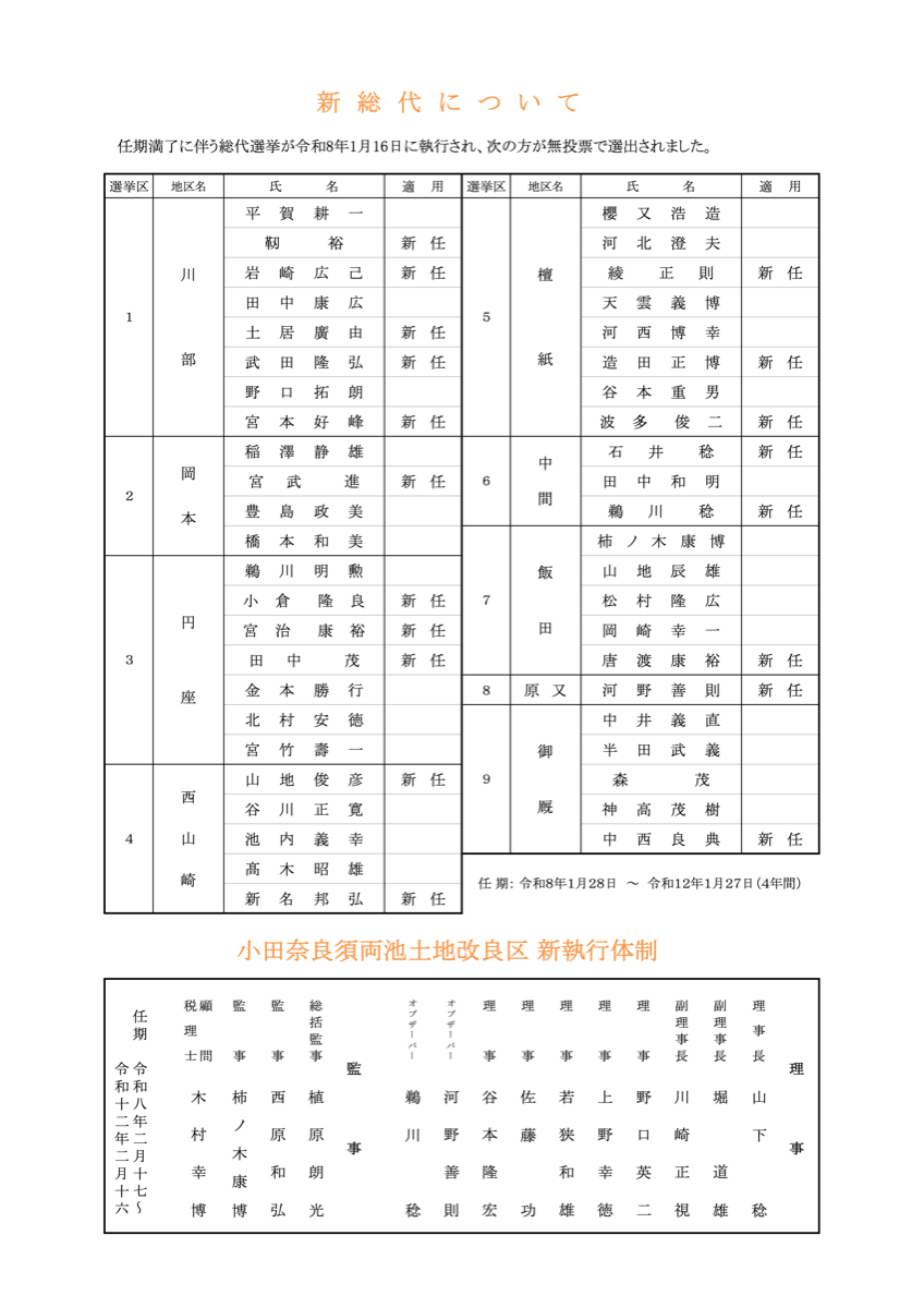 小田奈良須両池土地改良区 新執行体制